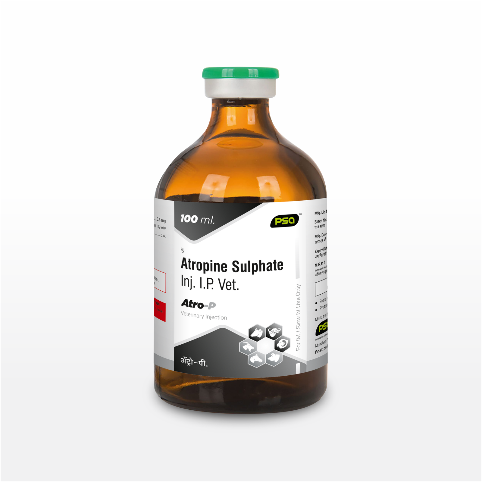 Product Type: Atropine Sulphate Inj. I.P. Vet. For IM / Slow IV Use Only Composition (Each ml. Contains): Atropine Sulphate I.P. (0.6 mg), Chlorocresol I.P. (0.1% w/v), Water for Injection I.P. (q.s.). Dosage: As directed by the Veterinarian.