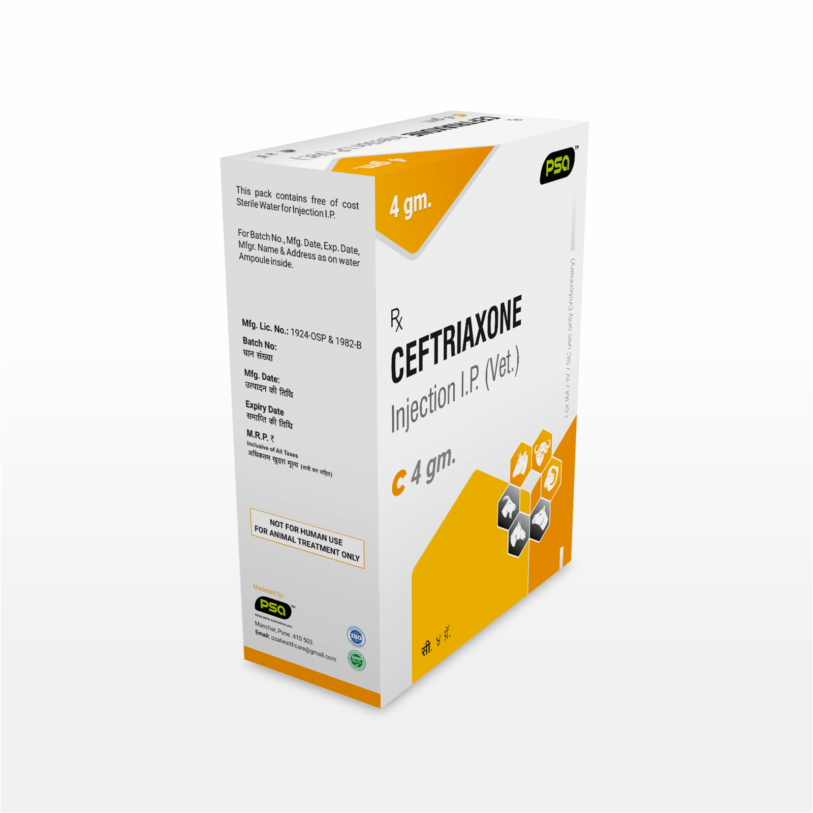 Product Type: Ceftriaxone Injection I.P. (Vet.) For IM/IV/SC use only (Veterinary) Composition (Each Vial Containing): Ceftriaxone Sodium IP (eq. to Anhydrous Ceftriaxone) (4gm). Description: This pack includes free of cost Sterile Water for injection IP. Dosage: As directed by the Veterinarian. Direction for use: Disperse/Dissolve the contents of Sterile Water for injection I.P. for I.M. / I.V. use. or as directed by the Veterinarian. Suspension / Solution should be used within 5 hours of preparation is stored below 25∘C or within 48 hours if stored between 2∘C to 10∘C.