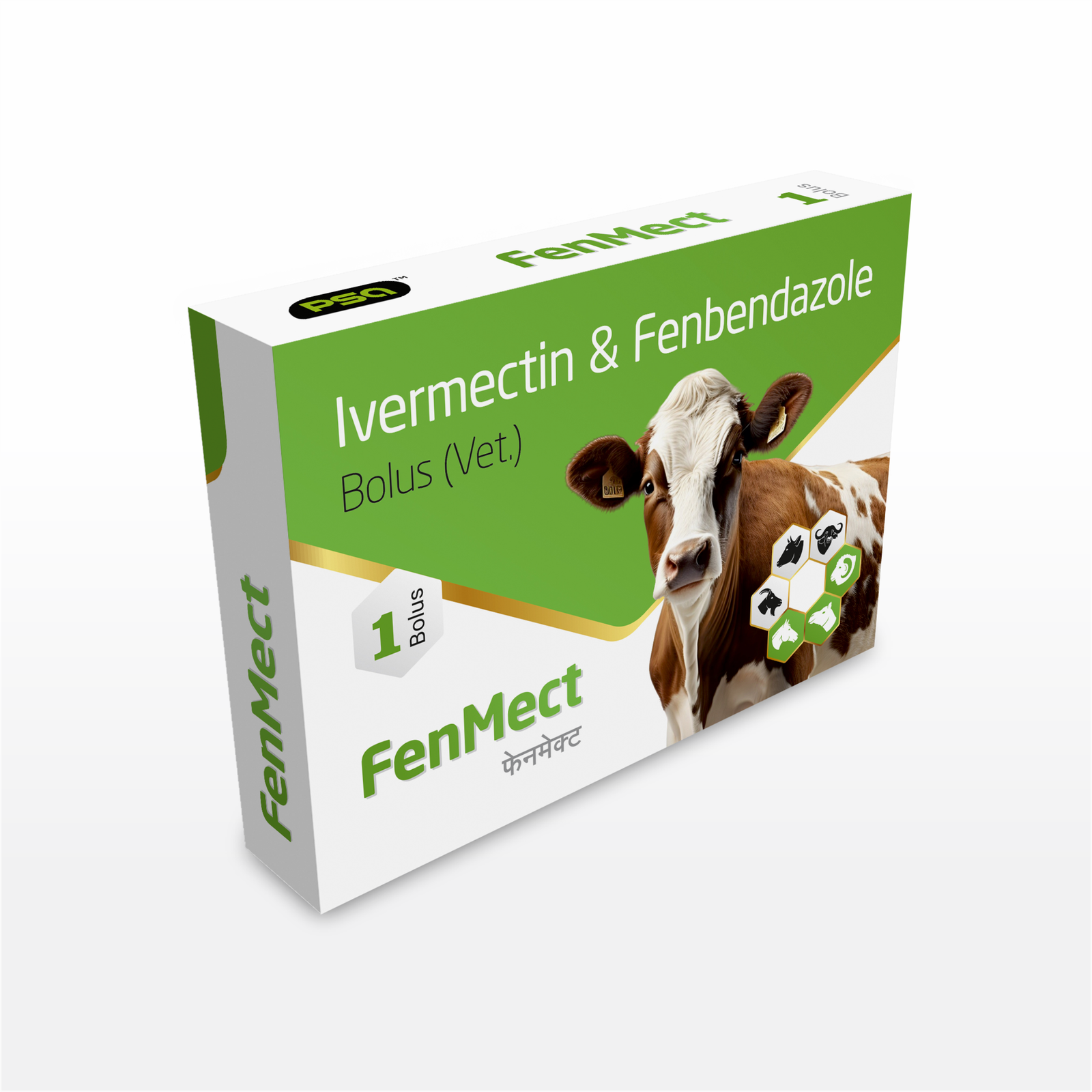 Composition (Each Uncoated Bolus Contains): Fenbendazole I.P. (3000 mg) , Ivermectin I.P. (100 mg) , Excipients (q.s.) .Effective Against: Round Worms , Tape Worms , Lung Worms , Liver Flukes & Ectoparasites .Dosage & Administration: As directed by the Veterinarian. For Round Worm/Tape Worms Infestations: Cattle & Buffalo: 7.5 mg/kgl Body Weight. For Liver fluke Infestations: Cattle & Buffalo: 15 mg/kg Body Weight.