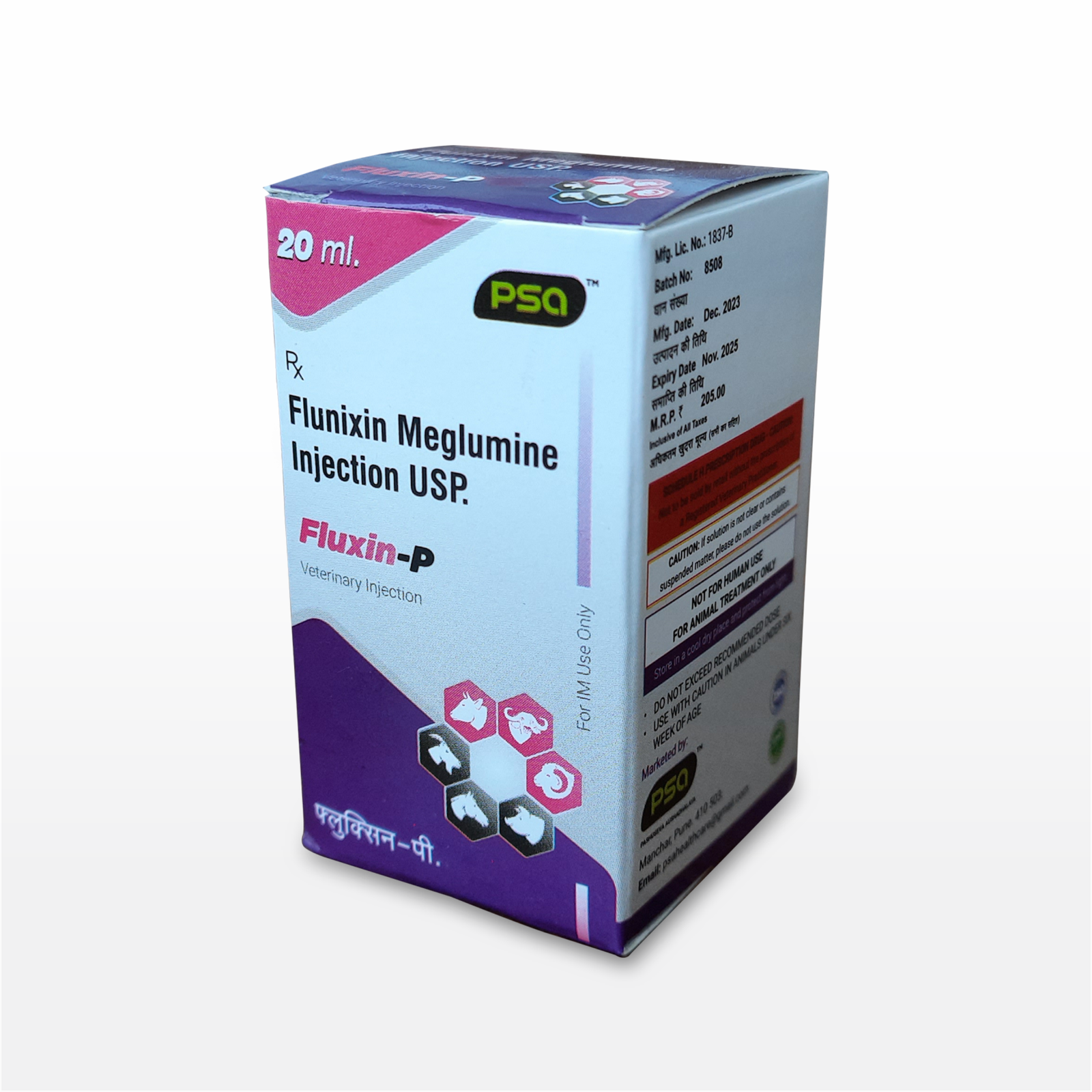 Product Type: Flunixin Meglumine Injection USP. Composition (Each ml. Contains): Flunixin Meglumine IP (83 mg) Equivalent to Flumixin (50 mg), Phenol IP (As preservative) (0.5% w/v), Water for Injection IP (q.s.). Dosage & Administration: Cattle, Sheep & Goat: 1.1 mg to 2.2 mg Flunixin per kg body weight or 1 ml to 2 ml of Flumin per 45 kg body weight to be given by slow I/V or IM Injection route. Dogs: 1 mg Flunixin per kg body weight to be given by slow I/V or I/M Injection route. Camel: 1.1 mg to 2.2 mg Flunixin per kg body weight or 1 ml to 2 ml of Flumin per 45 kg body weight to be given slow I/V or I/M Injection route. Horse: 1.1 mg Flunixin per kg body weight or 1 ml Flumin per 45 kg body weight to be given by slow IV Injection route, once daily up to 3-5 days. Pigs: 1 mg to 2 mg Flunixin per kg body weight to be given by S/C or slow I/V. Withdrawal Period: Milk: 48 hours after last administration; Meat-Cattle: 14 days after last administration; Meat-Horse: 28 days after last administration; Meat-Pigs: 24 days after last administration.