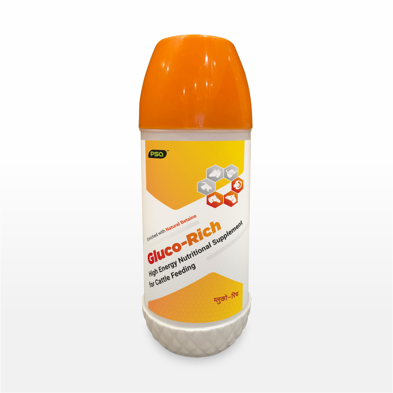Product Type: High Energy Nutritional Supplement for Cattle Feeding Enriched with Natural Betaine. Nutritional Supplement of specific Gluconeogenic precursors fortified with Minerals & Vitamins with added advantage of Nicotinamide and Cyanocobalamine .Benefits: Helps to enhance fermentation in the rumen , Increses availability of energy/glucose , Helps to stop formation of ketone bodies , Fulfills energy requirements , Improves Immune system .Dosage: Cattle: 100 ml-200 ml Daily; Sheep & Goat: 20 ml-50 ml Daily.
