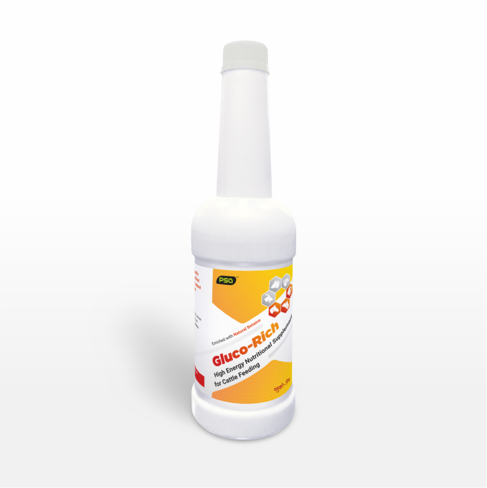 Product Type: High Energy Nutritional Supplement for Cattle Feeding Enriched with Natural Betaine. Nutritional Supplement of specific Gluconeogenic precursors fortified with Minerals & Vitamins with added advantage of Nicotinamide and Cyanocobalamine .Benefits: Helps to enhance fermentation in the rumen , Increses availability of energy/glucose , Helps to stop formation of ketone bodies , Fulfills energy requirements , Improves Immune system .Dosage: Cattle: 100 ml-200 ml Daily; Sheep & Goat: 20 ml-50 ml Daily.