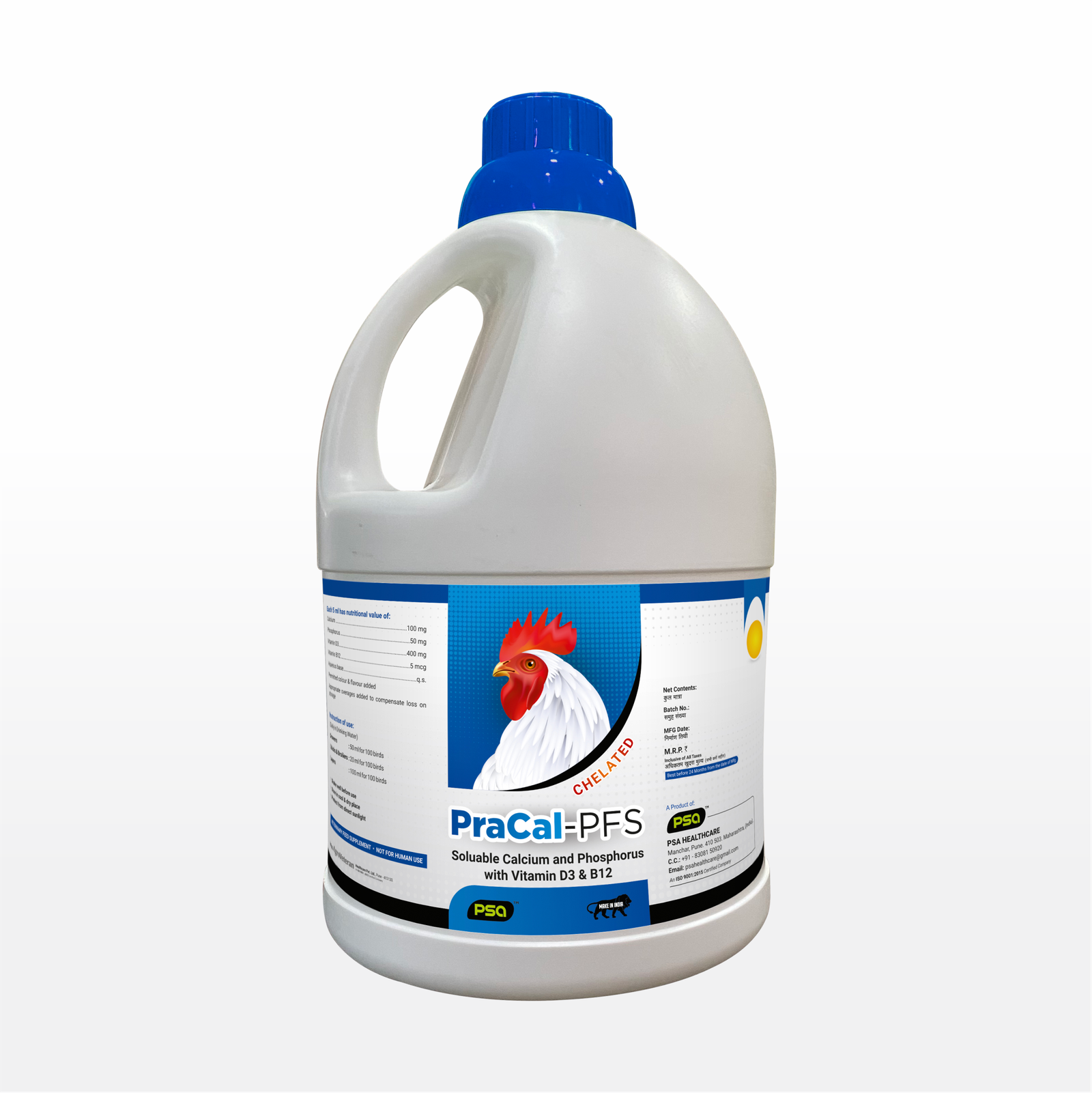 Product Type: Soluable Calcium and Phosphorus with Vitamin D3 & B12 (CHELATED) Nutritional Value (Each 5 ml has): Calcium (100 mg), Phosphorus (50 mg), Vitamin D3 (400 mg), Vitamin B12 (5 mcg), Aqueous base (q.s.). Permitted colour & flavour added. Appropriate overages added to compensate loss on storage. Instruction of use (Daily in Drinking Water): Growers: 50 ml for 100 birds; Chicks & Broilers: 20 ml for 100 birds; Layers: 100 ml for 100 birds.