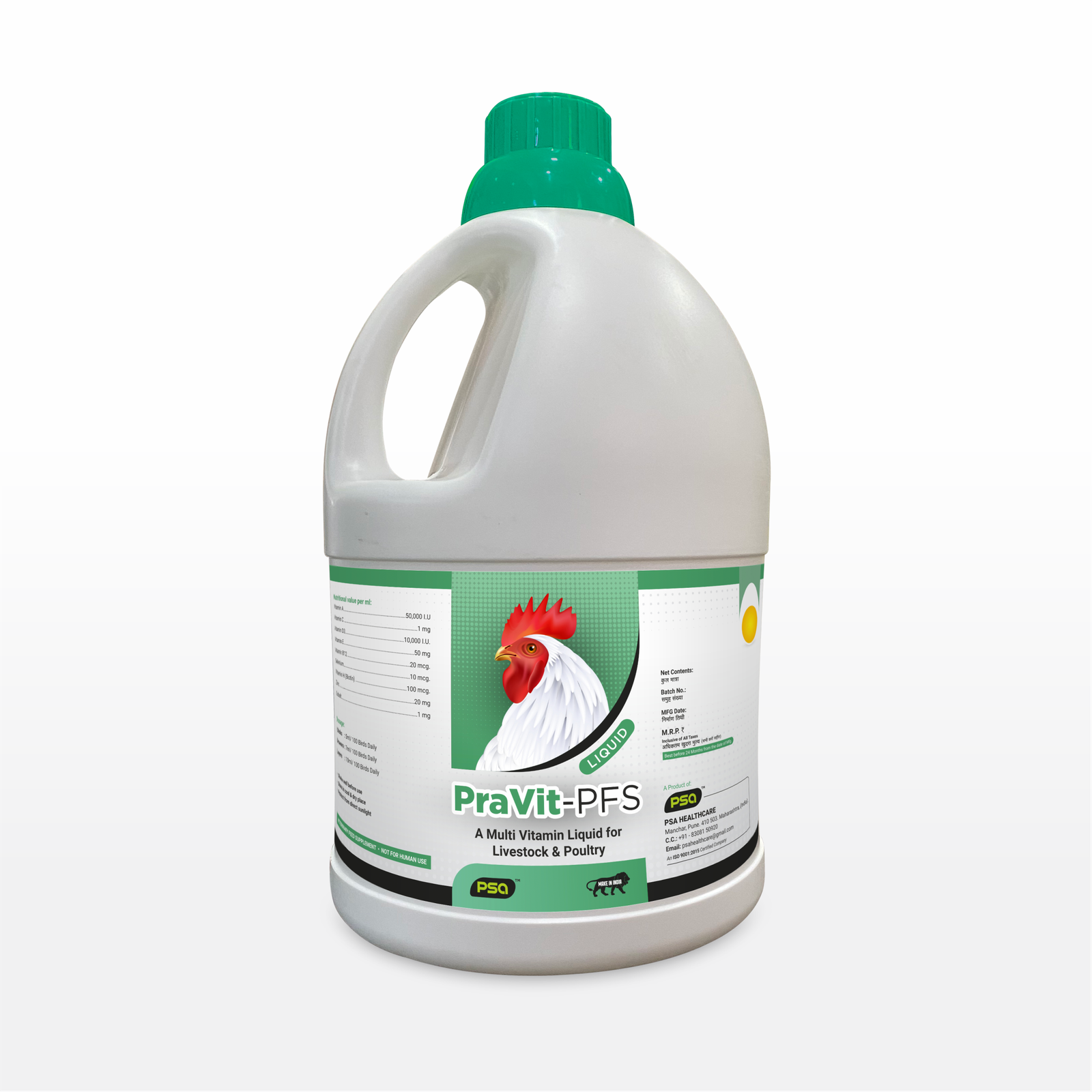 Product Type: A Multi Vitamin Liquid for Livestock & Poultry Nutritional Value (per ml): Vitamin A (50,000 I.U.), Vitamin C (1 mg), Vitamin D3 (10,000 I.U.), Vitamin E (50 mg), Vitamin B12 (20 mcg), Selenium (10 mcg), Vitamin H (Biotin) (100 mcg), Zinc (20 mg), Cobalt (1 mg). Dosage: Chicks: 5ml/100 Birds Daily; Growers: 7ml/100 Birds Daily; Layers: 10ml/100 Birds Daily.