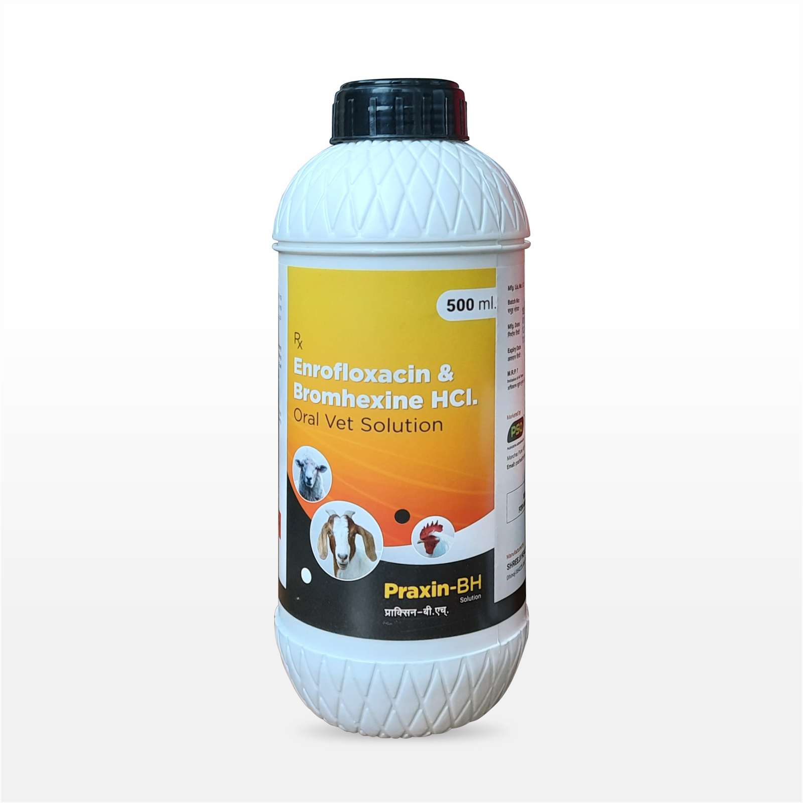 Product Type: Enrofloxacin & Bromhexine HCI. Oral Vet Solution Composition: Enrofloxacin I.P. (200 mg) , Bromhexine Hydrochloride I.P. (15 mg) , In a suitable base (q.s.) .Indications: For the control and treatment of severe respiratory infections of poultry caused by bacteria including Mycoplasmosis, Infectious Coryza, Salmonellosis, Fowl Cholera, Colibacillosis etc. .Dosage: 1 ml/10 kg body wt.. To be administered continuously for a period of 3-5 days once daily in drinking water depending up on the severity of infection or as recommended by the Veterinarian .Withdrawal Period: Chicken: 28 days; Eggs: 7 days.