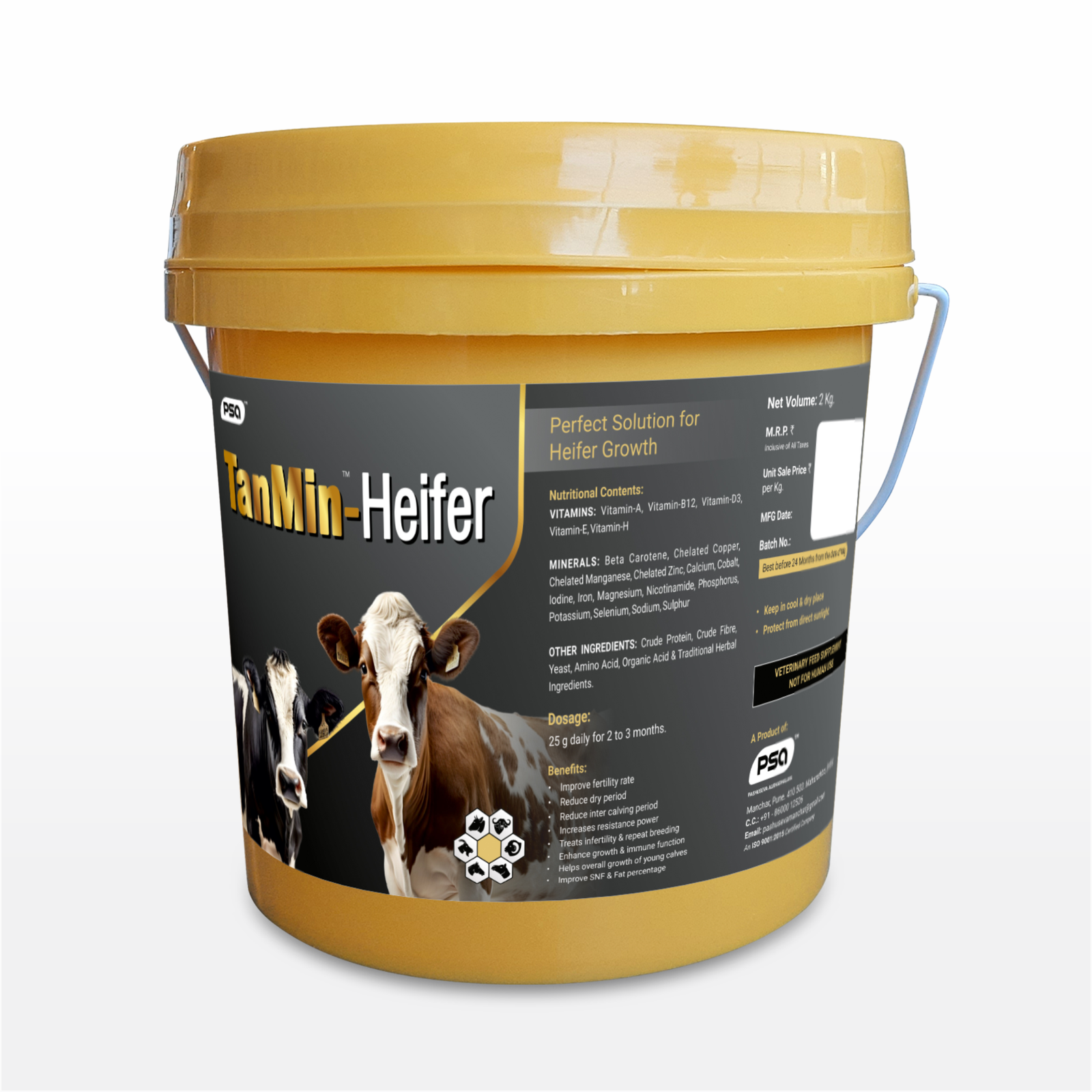 Product Type: Perfect Solution for Heifer Growth Nutritional Contents (VITAMINS): Vitamin-A, Vitamin-B12, Vitamin-D3, Vitamin-E, Vitamin-H .Nutritional Contents (MINERALS): Beta Carotene, Chelated Copper, Chelated Manganese, Chelated Zinc, Calcium, Cobalt, Iodine, Iron, Magnesium, Nicotinamide, Phosphorus, Potassium, Selenium, Sodium, Sulphur .OTHER INGREDIENTS: Crude Protein, Crude Fibre, Yeast, Amino Acid, Organic Acid & Traditional Herbal Ingredients .Benefits: Improve fertility rate , Increases resistance power , Treats infertility & repeat breeding , Enhance growth & immune function , Helps overall growth of young calves .Dosage: 25 g daily for 2 to 3 months.