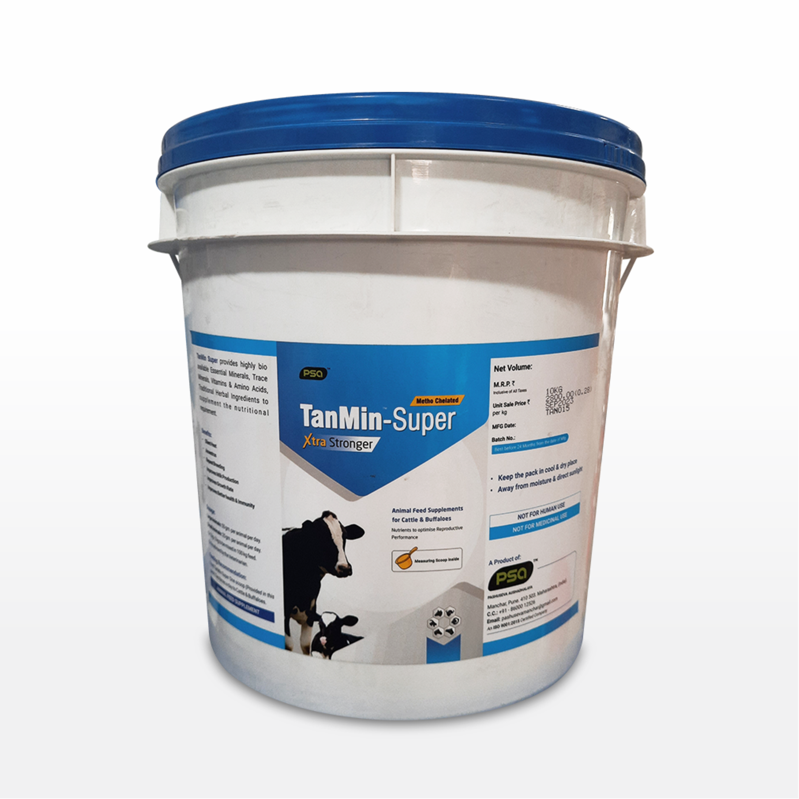 Product Type: Xtra Stronger. Provides highly bio available Essential Minerals, Trace Minerals, Vitamins & Amino Acids, Traditional Herbal Ingredients to supplement the nutritional requirement. Benefits: Silent Heat , Anoestrus , Repeat Breeding , Improves Milk Production , Improves Growth Rate , Improves Better health & Immunity.Dosage: Large Animals: 50 gm. per animal per day; Small Animals: 25 gm. per animal per day; Or 1 kg-2 kg to be mixed in 100 kg feed; Or As advised by the Veterinarian. Feeding Recommendation: Feed TanMin Super One scoop (Provided in this pack) Two times a day to Cattle & Buffaloes.