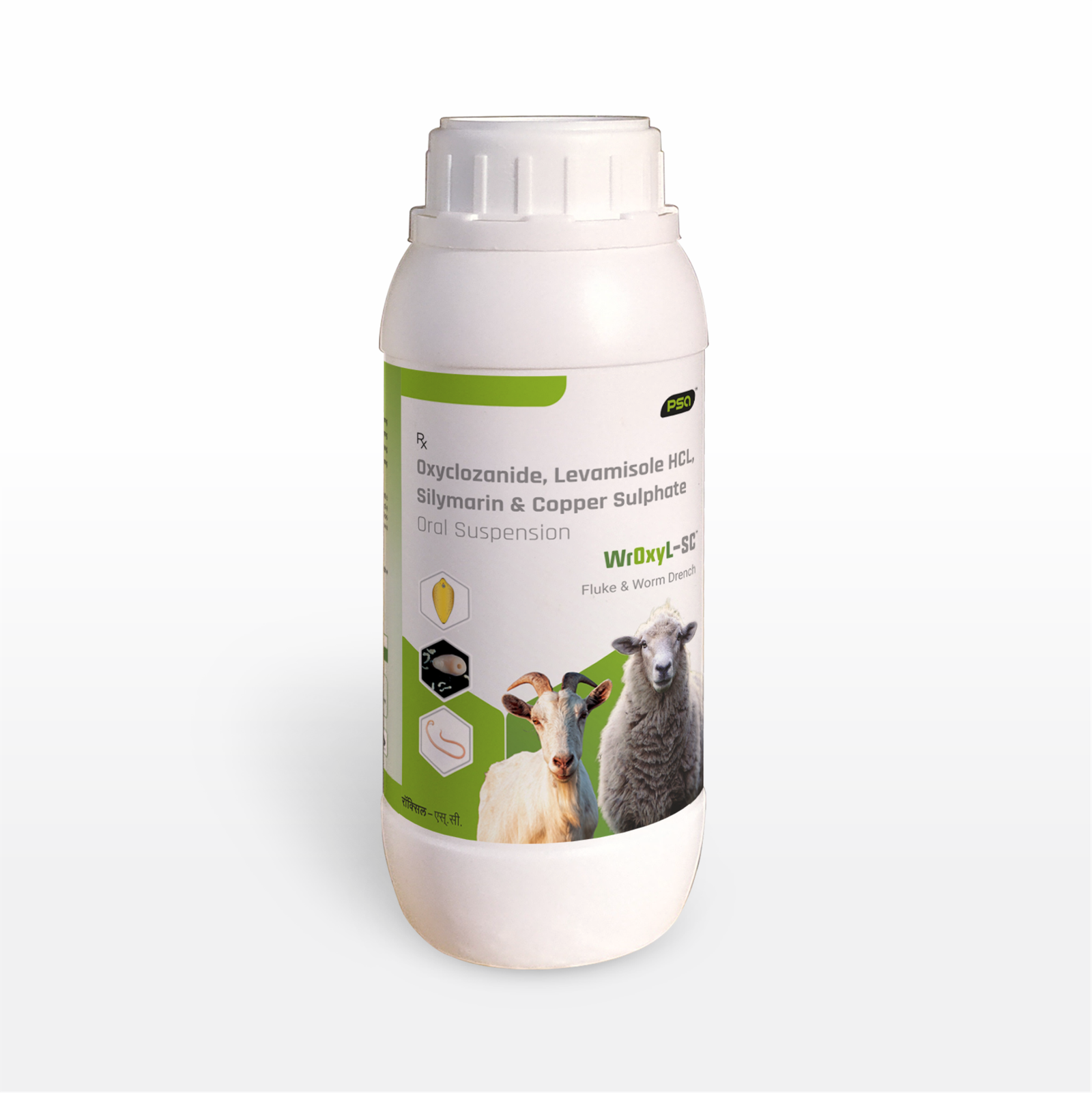 Product Type: Oxyclozanide, Levamisole HCL, Silymarin & Copper Sulphate Oral Suspension Composition (Each ml Contains): Oxyclozanide I.P. (Vet) (60 mg), Levamisole HCL I.P. (30 mg) , Silymarin USP (0.4 mg), Copper Sulphate I.P. (5 mg) , Aqueous base (q.s.) .Indications: WroxyL-SC drench is a broad spectrum anthelmintic used for the and control of Nematode and Fasciola infestations in cattle, sheep and goats. It is also effective against Amphistomes and Paramphi-stomes and tapeworms .Dosage: 1 ml./ per 4 kg. body weight Or As directed by the Veterinarian .Withdrawal Period: Milk: 7 days; Meat: 28 days.